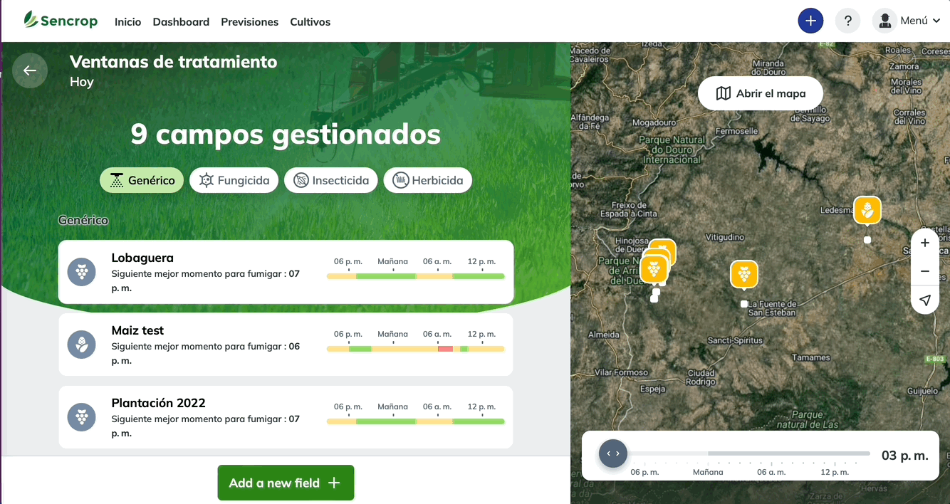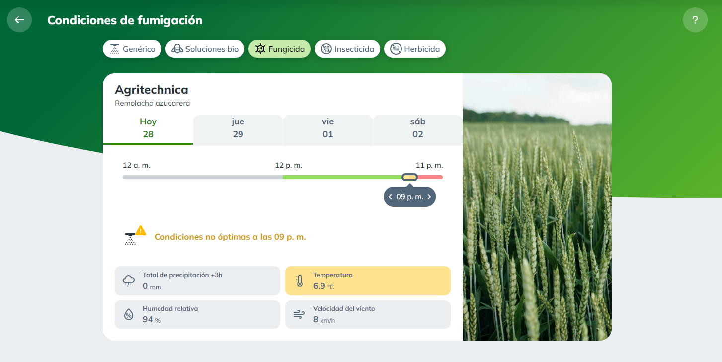 Las condiciones climáticas óptimas para la aplicación de los productos varían en función de su tipo. Por ejemplo, las limitaciones para aplicar un fungicida de contacto difieren de las de un herbicida radicular. Con nuestras ventanas de tratamiento, ahora puede seleccionar el tipo de producto que piensa aplicar: genérico, fungicida, insecticida, foliar, radicular, herbicida de contacto o sistémico. Recibirá recomendaciones específicas adaptadas a cada tipo de producto.