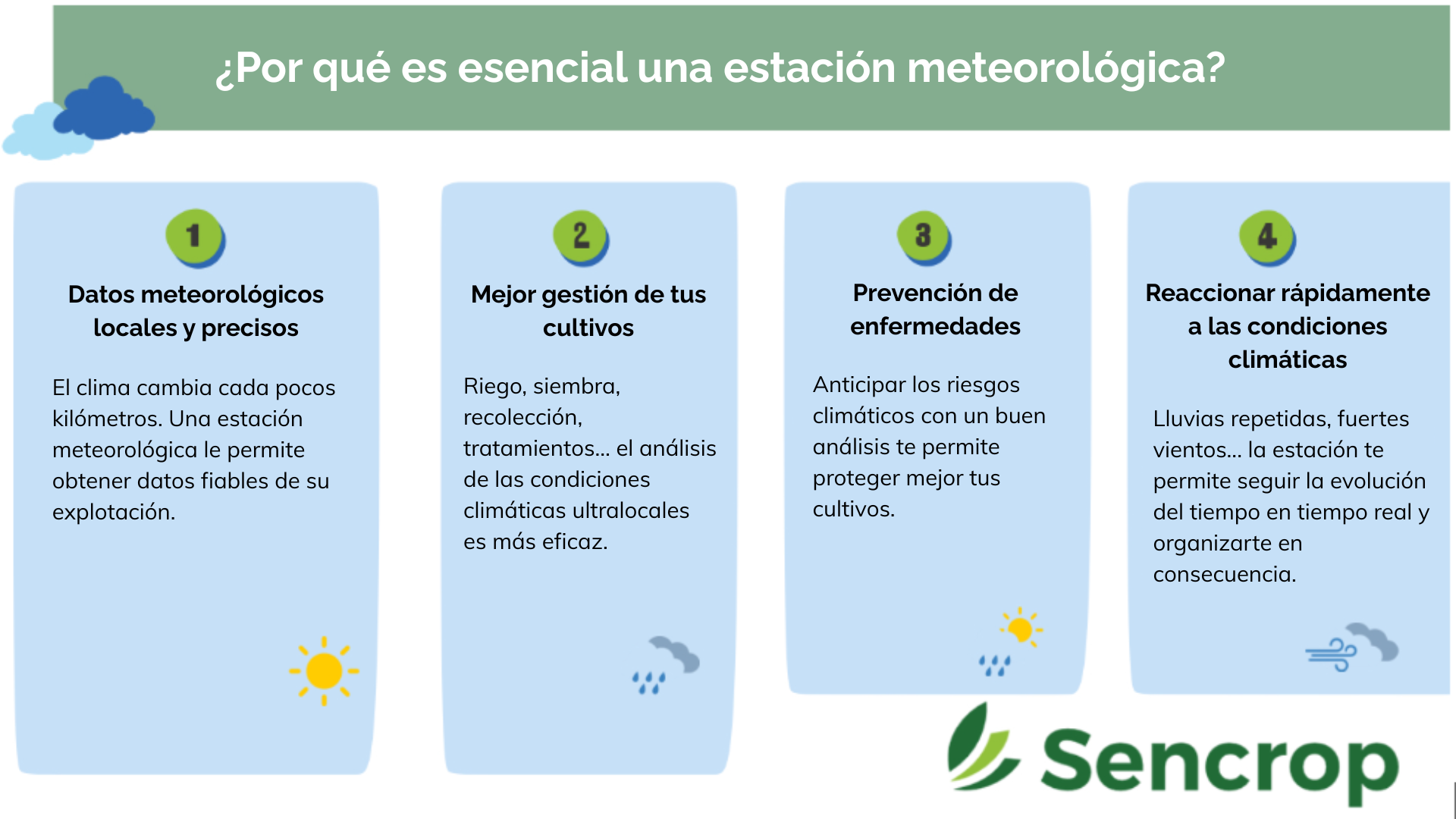 Para los agricultores, la estación meteorológica permitirá planificar acciones para proteger los cultivos de una enfermedad o un parásito, pero también anticipar o posponer una cosecha. El acceso a la información meteorológica en tiempo real requiere de una estación meteorológica profesional, con sensores fiables y correctamente instalados.
