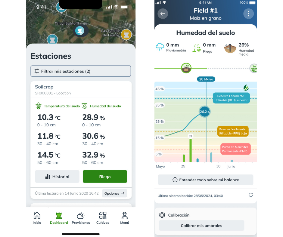 En la aplicación Sencrop, la lectura se traduce en lecturas en directo y en un gráfico del estado hídrico de su suelo (accesible con la opción "riego").